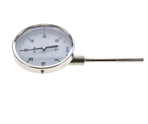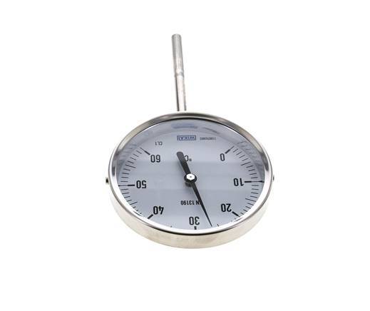Termómetro industrial bimetálico de conexión inferior con caja de acero inoxidable para medir temperaturas de 0 a +60°C. El temómetro tiene un vástago liso con un cuello de 18 mm. El diseño de acero inoxidable permite el funcionamiento hasta una presión máxima de 25 bar (363 psi). El termómetro tiene una carcasa de 100 mm y un vástago de acero inoxidable de 100 mm de largo y 8 mm de ancho que contiene la bobina bimetálica. Fabricado con una clase de tolerancia 1, según la norma EN 13190. Tiene una amplia gama de aplicaciones en la construcción de maquinaria, aire acondicionado, tuberías y aparatos. Grado de protección IP43.