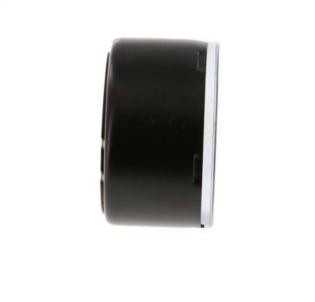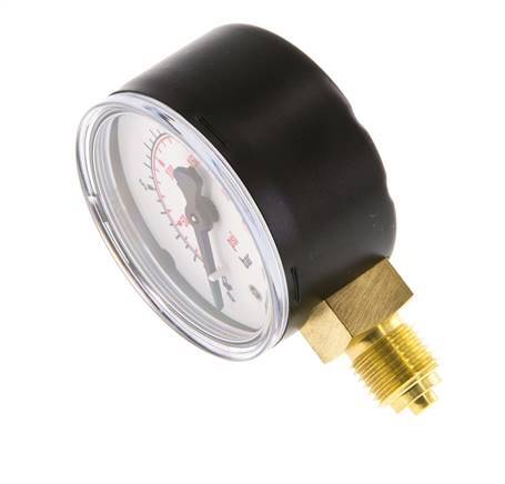 El manómetro MW01650SV está diseñado para medios gaseosos y líquidos y mide presiones dentro del rango de 0 a 16 bar (0,.232 psi). El medidor tiene dos escalas de medición en barra (negro) con división de escala de 0,5 y en psi (rojo). La clase de precisión de medición es 1,6 (± 1,6 % de desviación máxima). El cuerpo del indicador está hecho de acero, la conexión y el indicador están hechos de latón. Asegúrese de que su medio es compatible con latón. El punto de conexión para este manómetro se encuentra debajo del medidor. Como regla general, seleccione un presión que tenga una escala de clasificación de al menos un 25% superior a la presión máxima de funcionamiento.