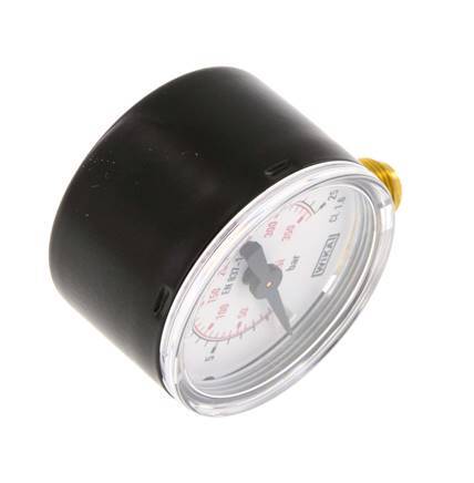 El manómetro MW02540SV-18 está diseñado para medios gaseosos y líquidos y mide presiones dentro del rango de 0 a 25 bar (0,363 psi). El medidor tiene dos escalas de medición en barra (negro) con división de escala de 1 y en psi (rojo). La clase de precisión de medición es 1,6 (± 1,6 % de desviación máxima). El cuerpo del indicador está hecho de acero, la conexión y el indicador están hechos de latón. Asegúrese de que su medio es compatible con latón. El punto de conexión para este manómetro se encuentra debajo del medidor. Como regla general, seleccione un presión que tenga una escala de clasificación de al menos un 25% superior a la presión máxima de funcionamiento.
