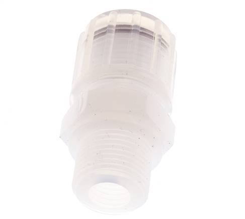 Esta conexión roscada recta pfa está diseñada con una conexión roscada macho y un puerto de conexión de anillo cortante. La conexión 1 es un anillo cortante de 12x9 mm. La conexión 2 tiene roscas macho G de 3/8 pulgadas. La presión máxima es de 10 bar (145 psi). El racor es adecuado para temperaturas de -40 a 180 °C (-40 a 356 °F).