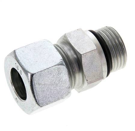 Esta conexión de rosca recta de acero galvanizado está diseñada con una conexión roscada macho y un puerto de conexión de anillo cortante. La conexión 1 es un anillo de corte de 16 mm con una tuerca de unión M24x1,5. La conexión 2 tiene rosca macho UNF de 7/8 pulgadas-14. La presión máxima es de 400 bar (5800 psi). El racor es apto para temperaturas de -40 a 120 °C (-40 a 248 °F). Se fabrica de acuerdo con la norma DIN EN ISO 8434-1 (DIN 2353).