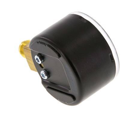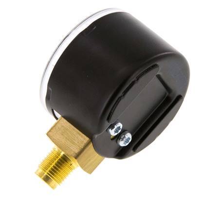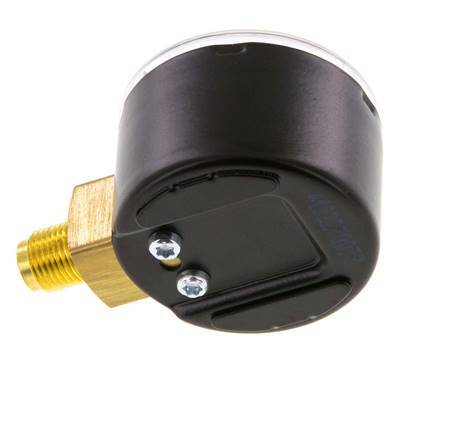 El manómetro MW-1040SV-18 está diseñado para aplicaciones de vacío y mide presiones dentro del rango de -1 a 0 bar (-15..0 psi). El medidor tiene dos escalas de medición en barra (negro) con división de escala de 0,05 y en psi (rojo). La clase de precisión de medición es 1,6 (± 1,6 % de desviación máxima). El cuerpo del indicador está hecho de acero, la conexión y el indicador están hechos de latón. Asegúrese de que su medio es compatible con latón. El punto de conexión para este manómetro se encuentra debajo del medidor. Como regla general, seleccione un presión que tenga una escala de clasificación de al menos un 25% superior a la presión máxima de funcionamiento.