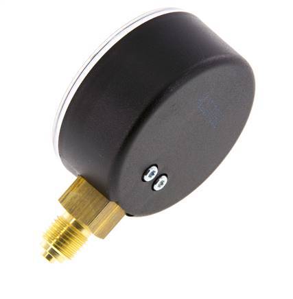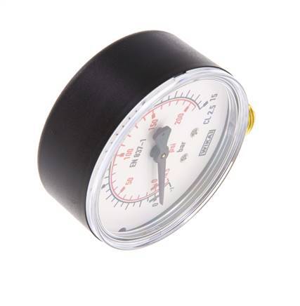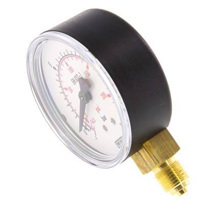 Manómetro MW-11563PV tiene un punto de conexión situado debajo del manómetro y mide presión en el rango de -1 a 15 bar (-15..218 psi) (para vacío). La división de la escala es 0 - 0,5 y la precisión de la medición clase 2,5 (± 2,5 %). La carcasa de plástico tiene un diámetro de 63 mm. El sistema de medición, el indicador y la conexión G 1/4 pulgadas están hechos de latón.