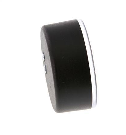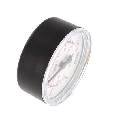 El manómetro MW-11P563PV está diseñado para aplicaciones de vacío y mide presiones dentro del rango de -1 a 1.5 bar (-15..22 psi). El medidor tiene dos escalas de medición en barra (negro) con división de escala de 0,1 y en psi (rojo). La clase de precisión de medición es 2,5 (± 2,5 % de desviación máxima). El cuerpo del medidor está hecho de plástico, la conexión y el indicador están hechos de latón. Asegúrese de que su medio es compatible con latón. El punto de conexión para este manómetro se encuentra debajo del medidor. Como regla general, seleccione un presión que tenga una escala de clasificación de al menos un 25% superior a la presión máxima de funcionamiento.