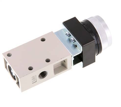 Elija una válvula de 3/2 vías para un cilindro de simple efecto con retorno por muelle, que requiere una sola acción para extenderse. Después de que el muelle retraiga el vástago de la válvula, ésta vuelve a su posición normal, sin accionar. Una válvula neumática de botón se utiliza para controlar manualmente otros dispositivos neumáticos dentro de un sistema. Hay varios tipos de actuadores de botón, como el botón pulsador, el botón de seta, el interruptor giratorio, el interruptor de llave, el interruptor de vaso o el botón de seguridad.
