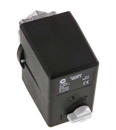 El presostato Condor MDR-3-16-K-RM tiene un rango de ajuste de 5 a 16 bar (73 a 232 psi) y contactos normalmente cerrados (NC) de 3 polos (DPST). Adecuado para el aire y el agua de -5 a 80°C (23 a 176°F). La capacidad de conmutación es trifásica de 3,0 kW de 120 V CA o 5,5 kW de 230 V CA o 7,5 kW de 400 V CA (según la norma EN 60947). Dispone de una robusta brida de fundición de aluminio con un puerto de conexión de G 1/2 pulgadas y juntas de NBR. Tiene una clasificación IP54.