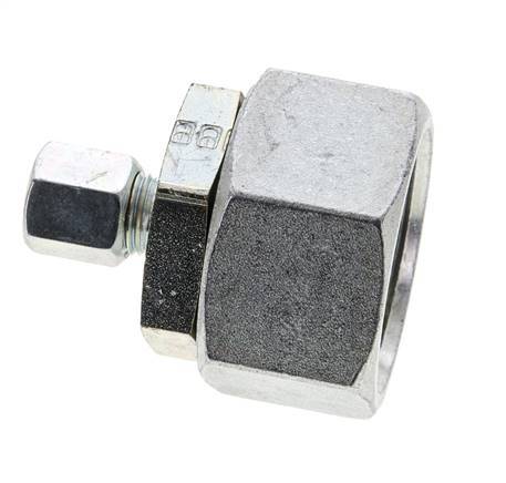 Esta conexión roscada recta de acero cincado está diseñada con orificios de conexión de anillo cortante y tubo giratorio. La conexión 1 es un anillo cortante de 6 mm con una tuerca de unión M14x1,5. La conexión 2 tiene una conexión de tubo giratorio de 30 mm. Dispone de una junta tórica y un cono de sellado para la estanqueidad. El material de la junta es NBR. La presión máxima es de 400 bar (5800 psi). El racor es adecuado para temperaturas de -35 a 100 °C (-31 a 212 °F). Se fabrica conforme a la norma DIN EN ISO 8434-1 (DIN 2353).