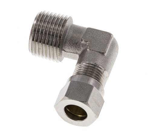 Este codo de latón niquelado de conexión roscada está diseñado con una conexión roscada macho y un puerto de conexión de anillo cortante. La conexión 1 es un anillo de corte de 8 mm con una tuerca de unión M12x1. La conexión 2 tiene rosca macho R 3/8 pulgadas. La presión máxima es de 100 bar (1450 psi). El racor es adecuado para temperaturas de -60 a 300 °C (-76 a 572 °F). Se fabrica de acuerdo con la norma DIN EN ISO 8434-1 (DIN 2353).