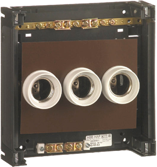 Esta caja de fusibles ABB Haf diazed con tapa elevada cerrada tiene un grupo de potencia y tres fusibles de tornillo de 63A. El armario tiene inserciones intercambiables en los laterales y está abierto por abajo y por arriba. Incluye carril neutro y de tierra. Carga continua máxima 35A.
