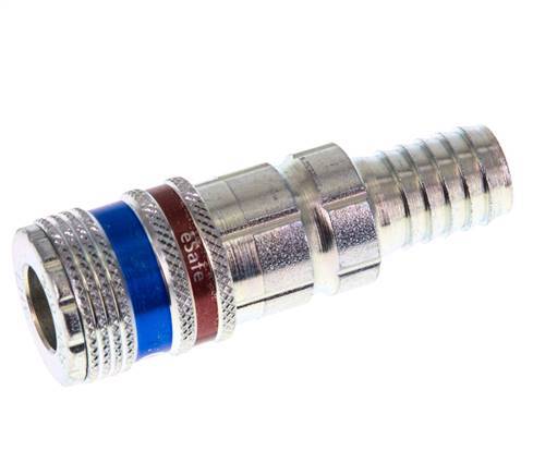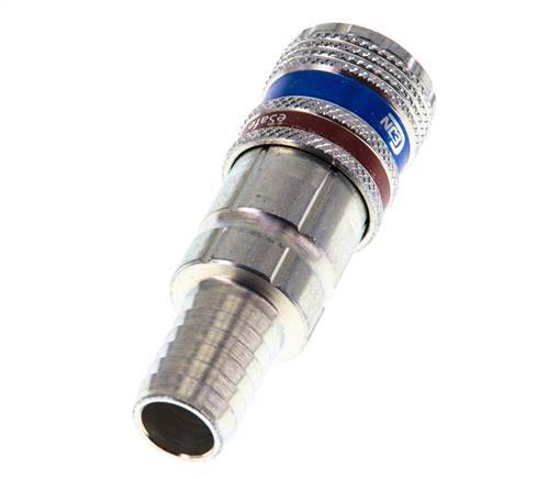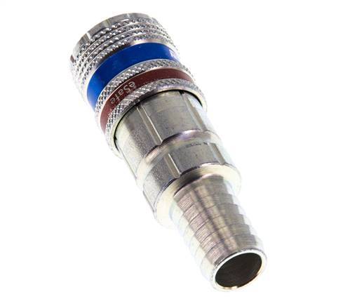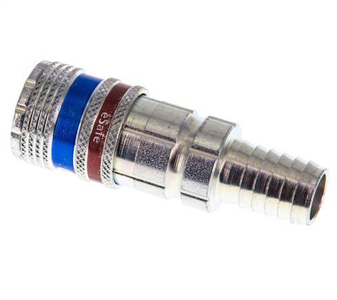 Estos acoplamientos de seguridad liberan la presión del aire de bajada en el lado de la clavija de forma segura y controlada, tirando del manguito de la toma. El tapón no se liberará antes de que la presión en el lado del tapón alcance un nivel bajo seguro. Así se evita el riesgo de un peligroso efecto látigo de toro que puede causar daños al hombre y a la máquina. Recomendamos utilizar tapones de acero endurecido con estos acoplamientos. Monte fácilmente una manguera sobre el pilar de manguera de 13 mm. Opcionalmente, pida una abrazadera de manguera para la correcta fijación de la misma. El rango de presión de funcionamiento es de 0 a 16 bar. La toma de corriente es adecuada para temperaturas entre -20 y 80°C. El caudal nominal es de 2250 l/min. El material de la junta es NBR (caucho de nitrilo). La carcasa de acero/latón tiene una protección superficial galvanizada/electrolítica. Este DN 7,6 mm tiene un perfil europeo y es popular en Europa.