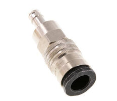 Toma de aire de acero/latón DN 10 con una conexión de pilar de manguera de 10 mm. Un acoplamiento neumático se utiliza para conectar rápidamente las herramientas neumáticas a una línea de aire comprimido. El acoplamiento requiere dos partes: la toma (hembra) y el enchufe o espiga (parte macho). Cuando se desconecta, el acoplamiento se apaga automáticamente para mantener la presión de la línea.