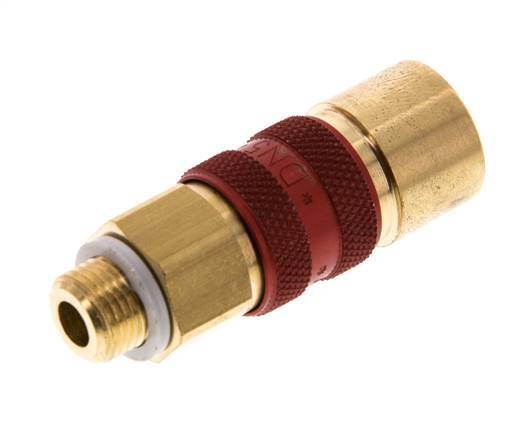 Toma de aire de latón DN 5 con código de color rojo y rosca macho G 1/8 pulgadas. Un acoplamiento neumático se utiliza para conectar rápidamente las herramientas neumáticas a una línea de aire comprimido. El acoplamiento requiere dos partes: la toma (hembra) y el enchufe o espiga (parte macho). Cuando se desconecta, el acoplamiento se apaga automáticamente para mantener la presión de la línea.