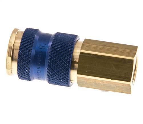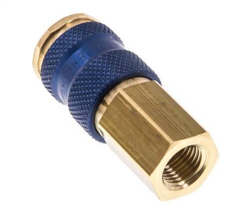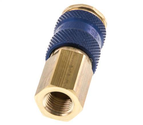 Toma de aire de latón DN 7,2 (Euro) con código de color azul y rosca hembra G 1/4 pulgadas. Un acoplamiento neumático se utiliza para conectar rápidamente las herramientas neumáticas a una línea de aire comprimido. El acoplamiento requiere dos partes: la toma (hembra) y el enchufe o espiga (parte macho). Cuando se desconecta, el acoplamiento se apaga automáticamente para mantener la presión de la línea.