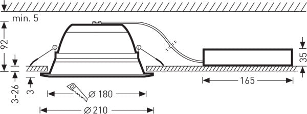 Downlight LED empotrado profesional con una salida de 1900lm a 106 lm/W de eficiencia. Incluye reflector altamente especular con distribución de haz simétrico estrecho. Presenta luz blanca cálida de 3000K, CRI>80 y difusor prismático de PMMA. Calificado para 25,000 horas de vida útil L80 con fuente LED reemplazable y equipo de control. Instalación a través de fijación por resorte en recortes de techo de 180-195mm. Clasificado IP20/IP44 con protección contra impactos IK02.