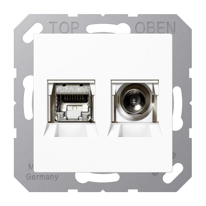 Esta toma de pared de comunicaciones de la gama A/AS de Jung dispone de un punto de conexión RJ45 Cat6a y conexión coaxial para realizar la conexión de red para aplicaciones de telefonía, Ethernet, IP o Internet. La caja de conexiones Smart TV forma una toma de corriente adaptada al espectador de televisión digital. Así ahorrará espacio, tiempo de instalación y cableado con esta práctica caja de conexiones para Smart TV. Además, esta toma de comunicaciones de la gama A/AS tiene un color blanco alpino.