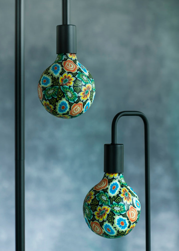 Lámpara de globo de filamento LED artística con una superficie de vidrio pintada y un diseño de flor oscura. Esta bombilla retrofit E27 produce 100 lúmenes a 1900K, funcionando a 230-240V con distribución de luz de 360°. La bombilla decorativa de 125x175mm combina eficiencia energética con estética contemporánea, creando una declaración visual ya sea iluminada o no.