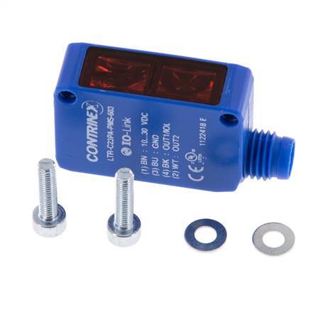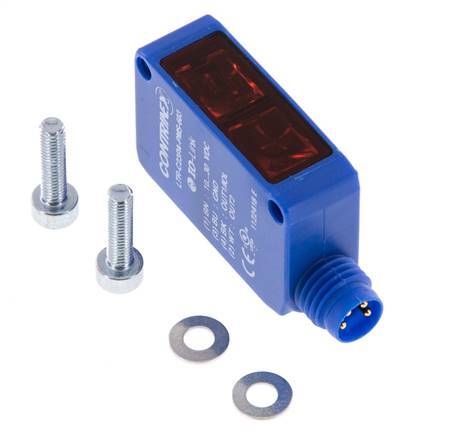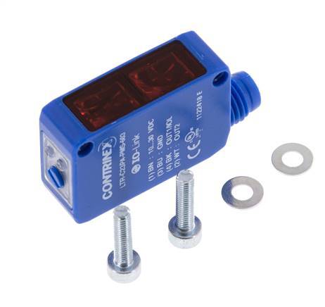 Esta barrera fotoeléctrica de reflexión tiene un transmisor y un receptor integrados en la misma carcasa. El campo de detección va de 3 a 1.500 mm y la distancia máxima de conmutación es de 1.300 mm. Tiene un conector M8 de 4 clavijas. Modo de conmutación: PIN 4 - conmutación por luz / enlace IO, PIN 2 - conmutación por oscuridad. La tensión de funcionamiento 10 - 30 V DC y la salida de control 100mA (PNP). El sensor es compatible con IO-Link.