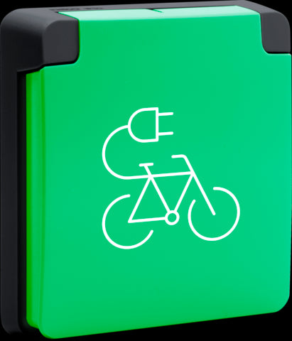 Punto de carga de bicicletas antisalpicaduras 16 A/250 Vca con toma de tierra de protección, seguridad para niños y con bornes enchufables, excepto caja de superficie. El enchufe está completamente cubierto por una tapa protectora con bisagras hacia arriba. Color: verde/negro.