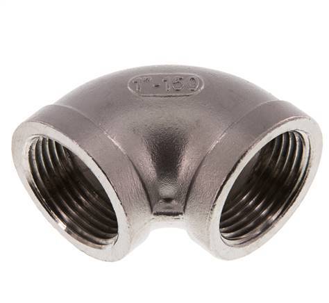 Este codo está diseñado con roscas hembra en ángulo. La conexión 1 tiene rosca hembra NPT de 1 pulgada. La conexión 2 tiene rosca hembra NPT de 1 pulgada. Es un accesorio de codo. Está fabricado en acero inoxidable (1.4408). A 20 °C (68 °F), puede manejar una presión máxima de 16 bar (232 psi). La entrada y la salida forman un ángulo de 90°.