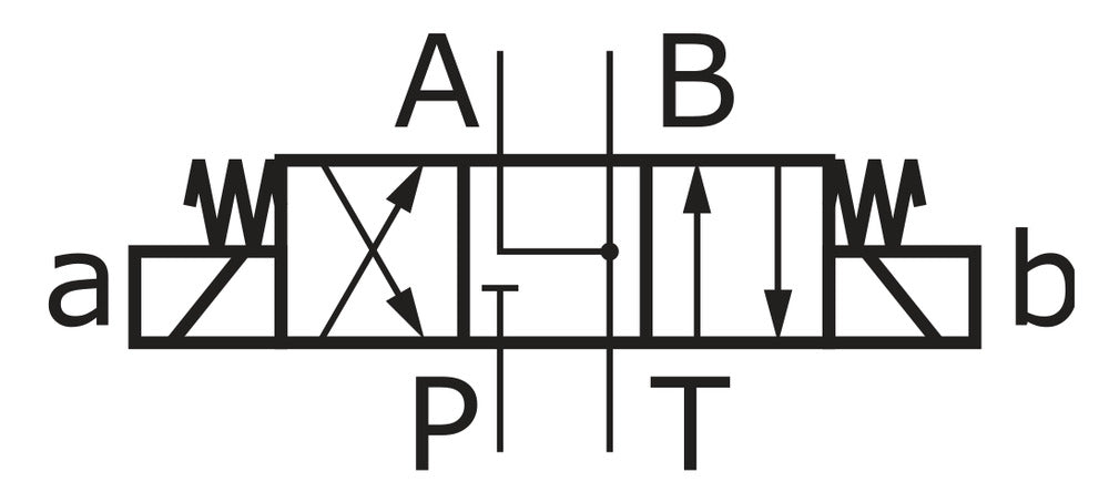Electroválvula hidráulica Argo-Hytos de 4/3 vías (tipo RPE3-06) con interfaz de montaje NG6 (D03) y bobina de 230 V CA. La posición inicial de esta válvula es p cerrada, a y b abiertas a t. La válvula es adecuada para un rango de temperaturas de -30 a 80 °C (-22 a 176 °F) y una presión máxima de 350 bares (5075 psi). La válvula tiene una carcasa de hierro fundido con junta de NBR (caucho nitrílico). El caudal máximo es de 80 l/min.