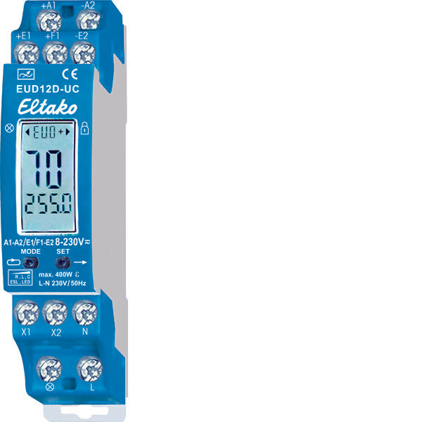 Este regulador EUD12D-UC de la serie EUD12 de Eltako es un regulador universal apto para lámparas incandescentes y halógenas (R), transformadores bobinados (L), transformadores eléctricos (C), lámparas de bajo consumo regulables (ESL) y lámparas LED regulables de 230 V de hasta 400 W. Conectando un interruptor de impulsos al regulador de intensidad, podrá regular fácilmente las luces a su gusto. Un breve impulso de control enciende o apaga las luces. Un pulso más largo controla la intensidad de la luz.