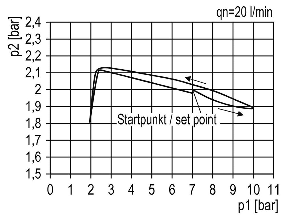 Este filtro regulador (FR) combina dos funciones. El filtro elimina el agua, la suciedad y otras partículas nocivas de más de 40 micras. El regulador de presión ajusta la presión continuamente a un nivel estable, incluso cuando la presión de entrada varía. El nivel puede ajustarse entre 0,5 y 10,0 bar (7 y 145 psi). Este modelo tiene puertos G 3/4 de pulgada. El caudal máximo es de 12000 l/min. Tenga en cuenta que el caudal máximo por sí solo no proporciona información suficiente para un dimensionamiento adecuado. Utilice la curva de caudal para determinar si la caída de presión (droop) dentro de su rango de caudal esperado es aceptable. La curva de caudal muestra el caudal para una presión de entrada establecida con múltiples presiones de salida. Para cada presión de salida, puede verse cómo cambia la presión al aumentar el caudal. Se recomienda utilizar el dispositivo en la zona plana de la curva, y no al principio o al final de la misma. Tenga en cuenta que el regulador de presión controla la presión de salida, no el caudal. La presión de salida puede ajustarse tirando del volante hacia arriba y girándolo.