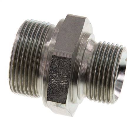 Esta espiga doble de acero está diseñada con rosca macho a macho. La conexión 1 tiene rosca macho G 1 1/4 pulgadas. La conexión 2 tiene rosca macho G de 1 pulgada. Presión máxima de 315 bar (4569 psi). Tiene una cónica de 60° dentro de la rosca macho.