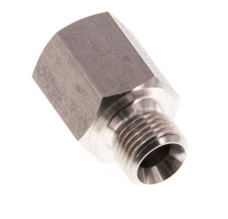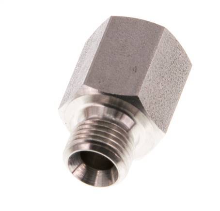 Esta boquilla reductora de acero inoxidable está diseñada con roscas macho y hembra. La conexión 1 tiene rosca hembra G 1/8 pulgadas. La conexión 2 tiene rosca macho G 1/8 pulgadas. Presión máxima de 40 bar (580 psi).