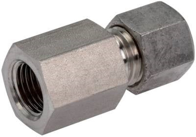 Este racor recto de acero inoxidable está diseñado con rosca hembra y un punto de conexión con anillo de compresión. La conexión 1 tiene rosca hembra G 1/8 pulgadas. La conexión 2 es un anillo de compresión de 6 mm. Adecuado para temperaturas de -60 °C a 400 °C (-76 °F a 752 °F). Presión máxima de 630 bar (9138 psi). Clasificado para una clase de carga S (pesada). Se fabrica de acuerdo con la norma DIN EN ISO 8434-1 (DIN 2353).