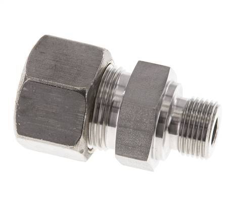 Esta conexión de rosca recta de acero inoxidable está diseñada con rosca macho y una conexión con anillo de compresión. La conexión 1 tiene rosca macho G 3/8 pulgadas. La conexión 2 es un anillo de compresión de 16 mm. Adecuado para temperaturas de -60 °C a 400 °C (-76 °F a 752 °F). Presión máxima de 400 bar (5802 psi). Clasificado para una clase de carga S (pesada). Se fabrica de acuerdo con la norma DIN EN ISO 8434-1 (DIN 2353).