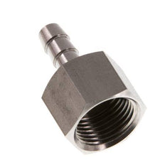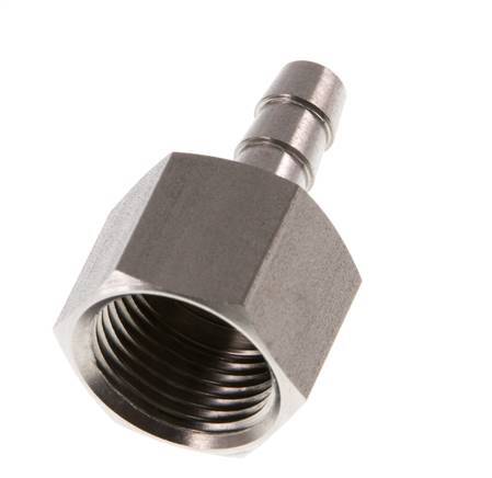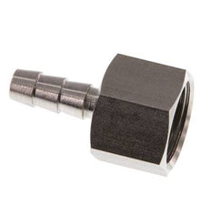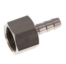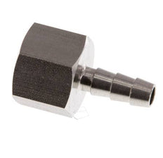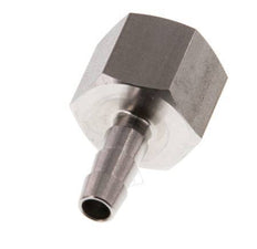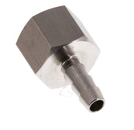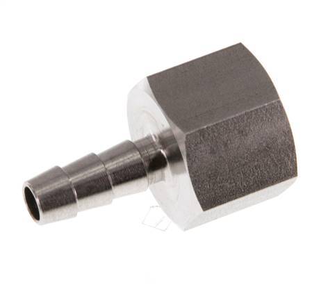 Esta conexión roscada para manguera de acero inoxidable está diseñada con una conexión de pilar para manguera y roscas G hembra. La conexión 1 tiene rosca hembra G 3/8 pulgadas. La conexión 2 es el pilar de la manguera, diseñado para una manguera con un diámetro interior de 6 mm. Presión máxima de 40 bar (580 psi).