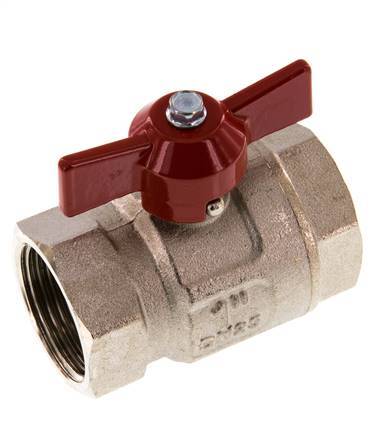 válvula de bola compacta de 2 vías con puertos G de 1 pulgada y una manija de mariposa para el control de flujo de encendido/apagado. El diámetro de la válvula es de 25 mm y la presión máxima es de 40 bar o 580 psi. Apto para agua, medios neutros, gaseosos y no agresivos, líquidos, aceites minerales y aire comprimido. También es adecuado para el vacío (máx. -0,9 bar o -13 psi). Adecuado para temperaturas de -20 a 150 °C (-4 a 302 °F). Carcasa de latón niquelado, bola de latón cromado duro y juntas de PTFE/NBR.