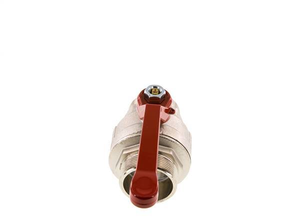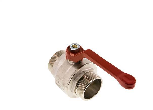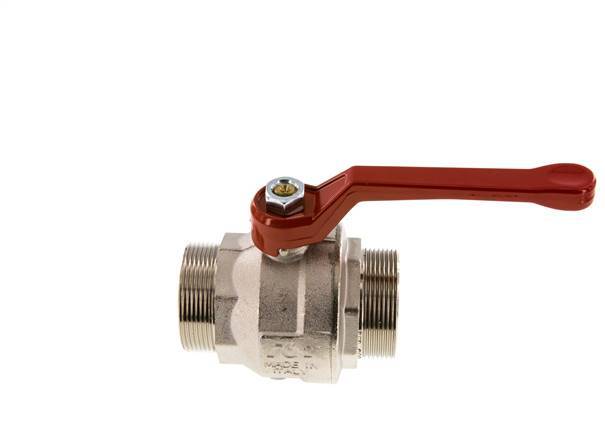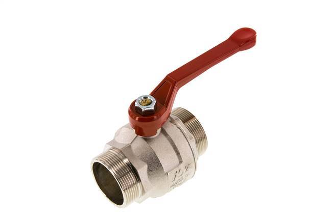 válvula de bola de latón de 2 vías con rosca macho, con puertos G de 2 pulgadas y una manija para controlar el flujo de encendido/apagado. 50 mm de diámetro nominal y una presión máxima de 30 bar (435 psi). La válvula es adecuada para agua (sin vapor), medios líquidos neutros, gaseosos y no agresivos, aceites minerales, combustible y aire comprimido, vacío (máx. -0,9 bar o -13 psi). La válvula puede utilizarse en un rango de temperaturas de -10 a 95 °C (14 a 203 °F). Carcasa de latón niquelado, bola de latón y juntas de PTFE/NBR.