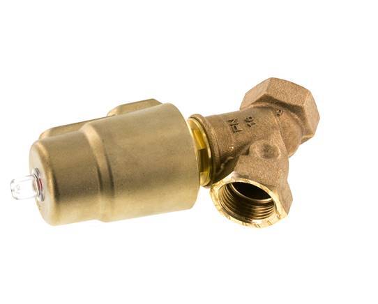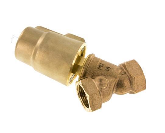 Esta válvula de pistón de latón normalmente cerrada G 1" de asiento en ángulo proporciona un control de cierre fiable para gases y fluidos. El asiento y la junta del husillo son respectivamente de PTFE/NBR. Adecuado de 0 a 16 bar y temperaturas de -20 a 85°C. La válvula funciona con aire comprimido de 6 bares preferiblemente. Excelente caudal gracias al diseño en forma de Y. Consejo: para caudales de líquido rápidos, seleccione válvulas de "cierre contra caudal" para evitar los golpes de ariete.