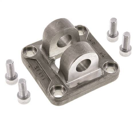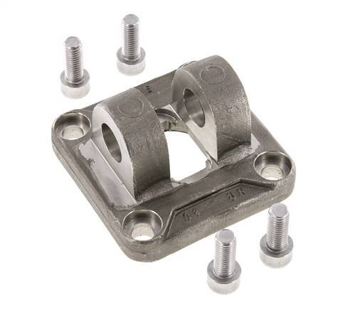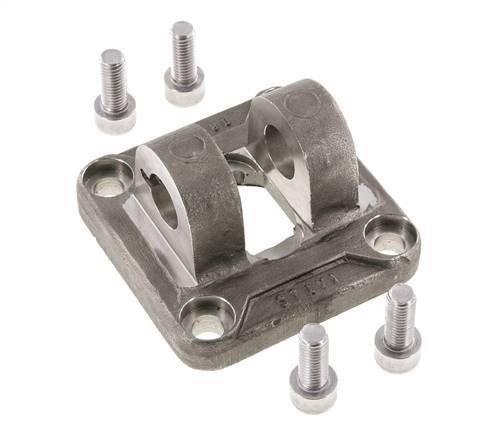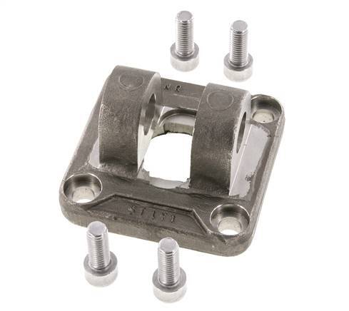 Este accesorio de montaje de horquilla hembra de acero puede montarse en cilindros ISO 15552 e ISO 21287 de 80 mm de diámetro utilizando los 4 pernos (incluidos). Utilice una clavija de 20 para la conexión (disponible por separado). Se puede utilizar para montar directamente en el cilindro o como contrabisagra.