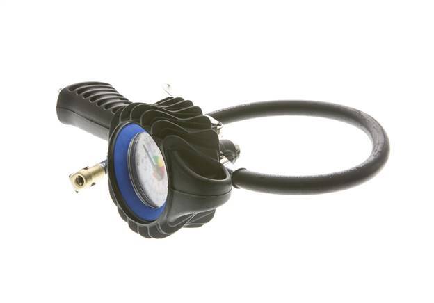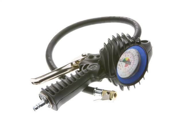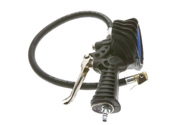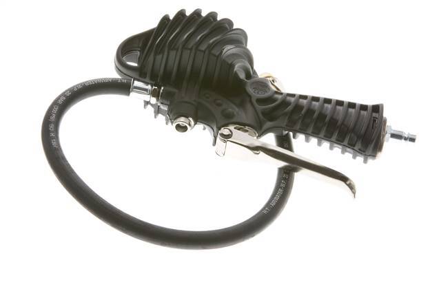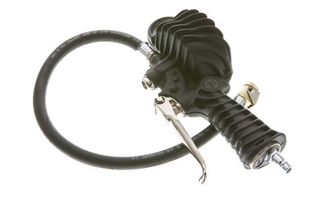 Se trata de un inflador de neumáticos sin calibrar con empuñadura de pistola y conexión de entrada de aire de acoplamiento europeo DN 7,2. La manguera de llenado flexible tiene una conexión roscada G 1/4" rígida en un extremo y un tapón de conexión de clip para válvulas de neumáticos Vg 8 (7,7 mm) en el extremo opuesto.