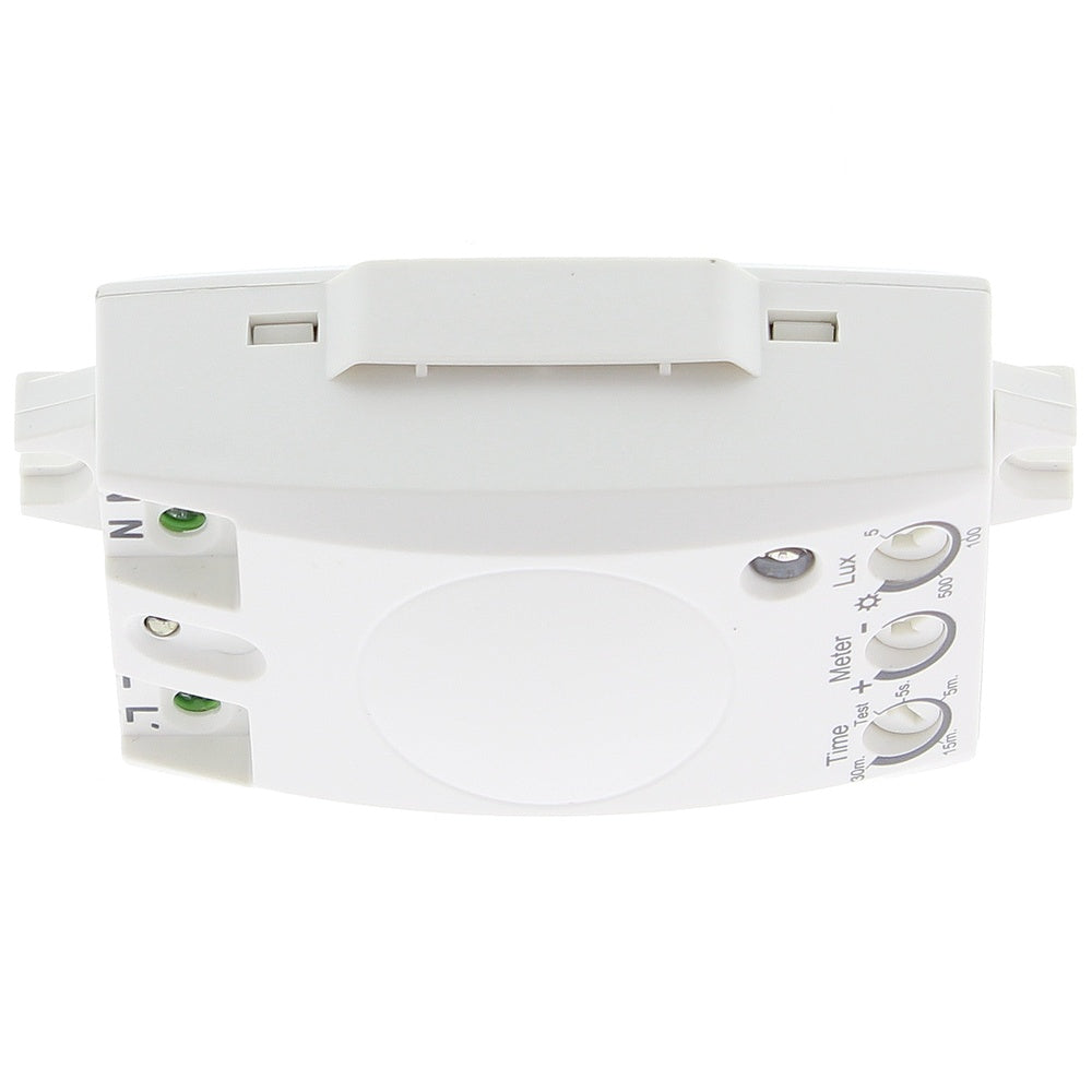 Interruptor de movimiento Klemko (completo), blanco, empotrado, versión con detector de presencia, grado de protección (IP) IP20, altura óptima de montaje 2,5 m, tipo de transductor de alta frecuencia, alcance máximo frontal 10 m, alcance máximo lateral 10 m, rango de ángulo horizontal 1 - 360°, control HVAC.