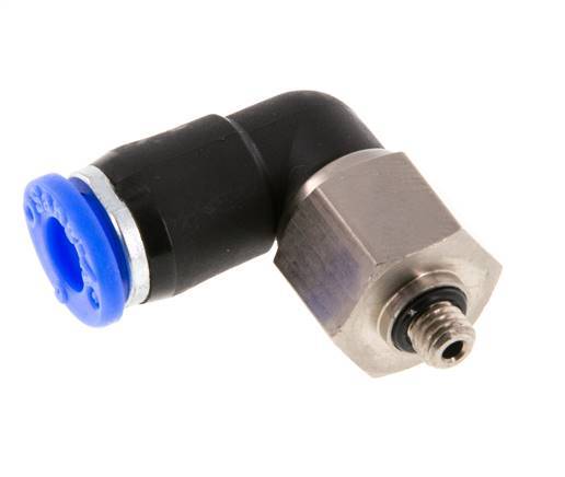 Se trata de una junta giratoria en forma de codo con un orificio de introducción y un orificio de conexión roscado para conectar una manguera a una tubería o componente neumático. La conexión 1 es un puerto de 6 mm. La conexión 2 tiene rosca hembra. La conexión de rosca macho tiene una junta tórica. El cuerpo es de latón/pbt niquelado. El material de la junta es NBR. El rango de presión de funcionamiento es de -0,95 a 10 bar (-14 a 145 psi), por lo que es adecuado para los vacíos. El racor es apto para temperaturas de -0 a 60 °C (-32 a 140 °F). Puede soportar 500 rotaciones por minuto. El racor se instala fácilmente empujando el tubo neumático contra el extremo del anillo de liberación del racor hasta que se detenga, y la garra interna lo fija en su sitio. Se desinstala fácilmente empujando el anillo de liberación hacia el interior del accesorio y tirando del tubo hacia atrás.