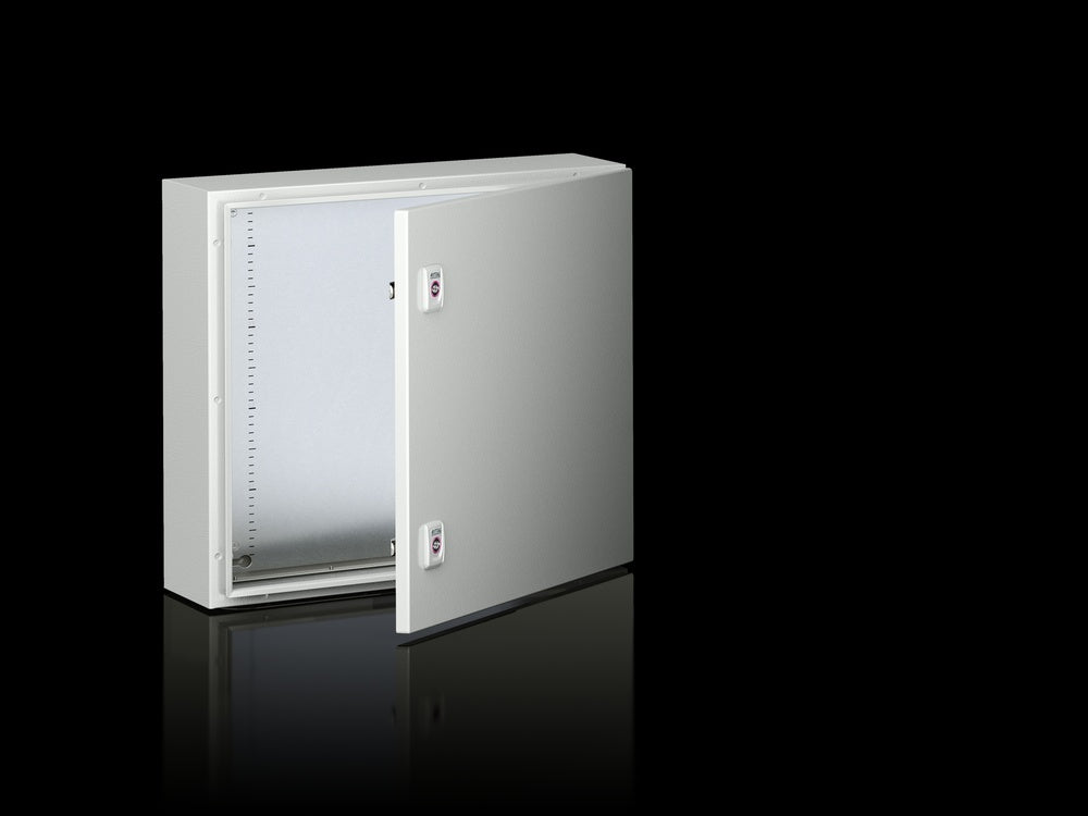 Kit de accesorios de hardware de montaje especializado, diseñado específicamente para enclosures de acero laminado Rittal AX con configuración de puerta única. Compatible con enclosures que cuentan con una placa de entrada de cable y mecanismos de bloqueo de palanca simple o doble. Componentes de instalación esenciales empaquetados como un conjunto completo para el ensamblaje profesional de enclosures.