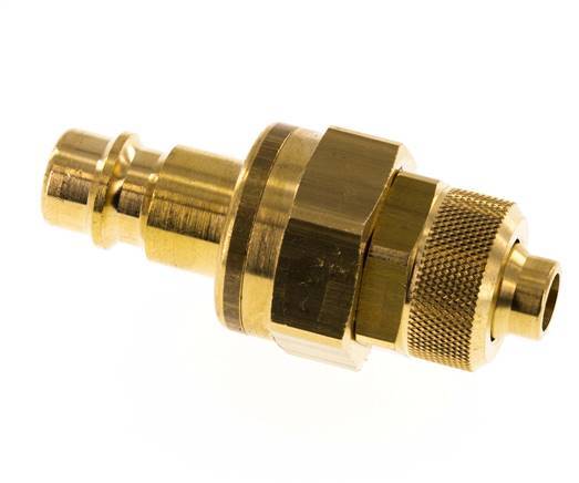 Tapón de acoplamiento de aire DN 7,2 (Euro) de latón con tuerca de unión para mangueras de 8x10 mm. El tapón tiene un diseño de cierre de doble cara. El rango de presión de funcionamiento es de -0,95 (apto para vacíos) a 35 bar. El tapón es apto para temperaturas entre -20 y 100°C. El caudal es de 800 l/min.