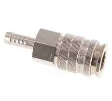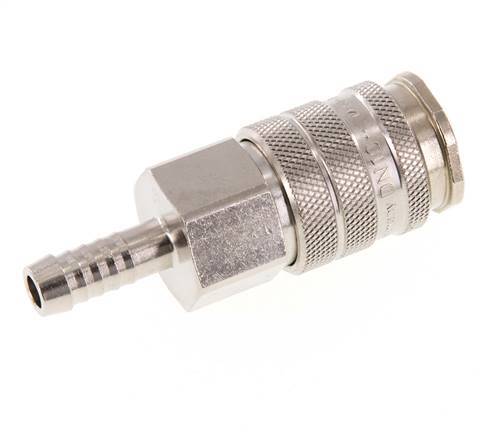 Monte fácilmente una manguera sobre el pilar de la manguera de 9 mm. Opcionalmente, pida una abrazadera de manguera para la correcta fijación de la misma. Este acoplamiento es adecuado para aplicaciones de vacío. El enchufe tiene un diseño de cierre de doble cara. Pueden utilizarse con enchufes normales y con enchufes de doble cara. Cuando los tapones de cierre de doble cara se desconectan, cierran el flujo en ambas direcciones. El rango de presión de funcionamiento es de 0 a 35 bar. La toma de corriente es adecuada para temperaturas entre -20 y 100°C. El caudal nominal es de 2100 l/min. El material de la junta es NBR (caucho de nitrilo). El material del manguito es el acero. La carcasa de latón niquelado tiene una protección superficial niquelada.
