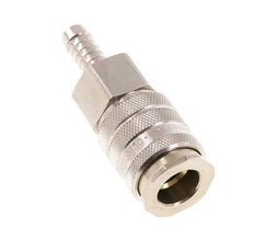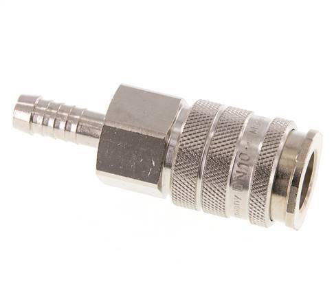 Toma de aire de latón niquelado DN 10 con conexión de pilar de manguera de 9 mm. Un acoplamiento neumático se utiliza para conectar rápidamente las herramientas neumáticas a una línea de aire comprimido. El acoplamiento requiere dos partes: la toma (hembra) y el enchufe o espiga (parte macho). Cuando se desconecta, el acoplamiento se apaga automáticamente para mantener la presión de la línea.
