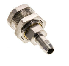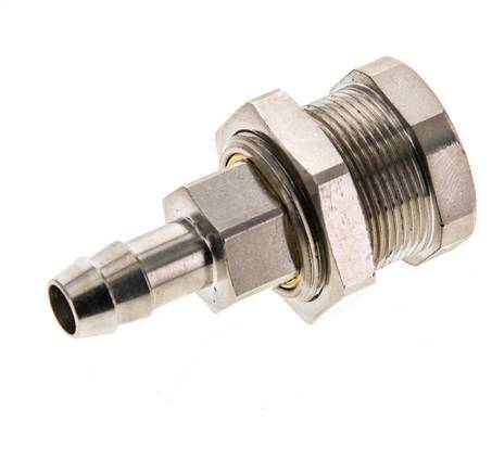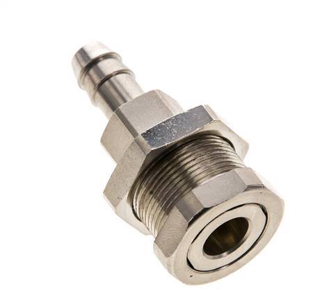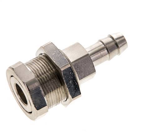 Monte fácilmente una manguera sobre el pilar de manguera de 8 mm. Opcionalmente, solicite una abrazadera para fijar correctamente la manguera. La toma tiene rosca pasamuros para montarla en un panel. Este acoplamiento es adecuado para aplicaciones de vacío. El enchufe tiene un diseño de doble cierre. Pueden utilizarse con enchufes normales y con enchufes de "doble cierre". Cuando se desconectan los tapones de cierre de doble cara, cierran el paso en ambas direcciones. El rango de presión de funcionamiento es de -0,95 a 35 bar. La toma es adecuada para temperaturas entre -20 y 100°C. El caudal nominal es de 360 l/min. El material de la junta es NBR (caucho de nitrilo). La carcasa de latón niquelado tiene una protección superficial niquelada.