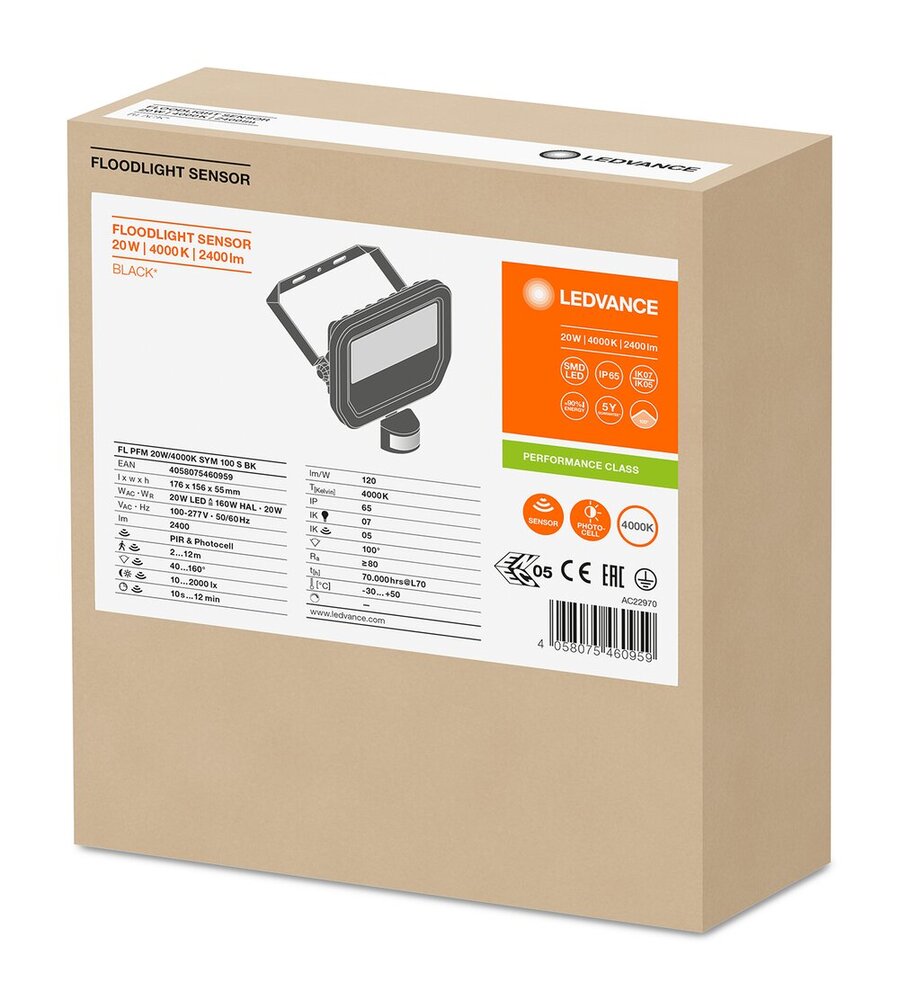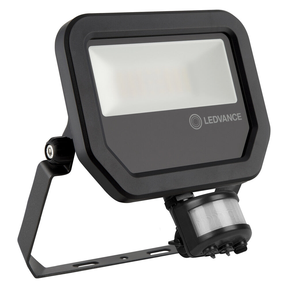 Ledvance Floodlight Sensor downlight/spot/spotlight, subcategoría floodlight, flujo luminoso 2400lm, flujo luminoso efectivo según IEC 2400lm, temperatura 4000K, color de la luz blanco, adecuado para potencia de lámpara 20W, potencia de sistema 20W, carcasa negra, grado de protección (IP) IP65, con sensor de movimiento.