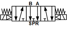 Una válvula de 5/3 vías tiene cinco puertos y tres posiciones. La posición central (de reposo) puede tener varias funciones; con una válvula "central cerrada", los cinco puertos están cerrados en la posición central. Las otras dos posiciones están controladas cada una por su propia bobina. Estas posiciones se utilizan para alimentar el puerto A y ventilar el puerto B, o al revés. Si no se activa ninguna de las dos bobinas, la válvula vuelve a la posición central (monoestable). Esta válvula puede utilizarse, por ejemplo, para controlar un cilindro de doble efecto, con la posibilidad de bloquear el cilindro en posiciones intermedias. Al activar una de las dos bobinas, el cilindro puede moverse en dos direcciones. La figura siguiente muestra un dibujo esquemático del funcionamiento del circuito de una válvula de 5/3 vías cerrada por el centro.