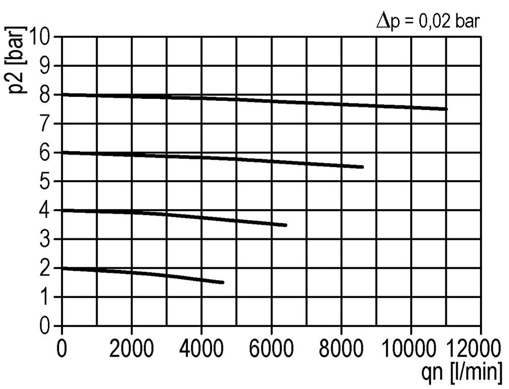 El filtro elimina el agua, la suciedad y otras partículas nocivas de más de 0,3 micras. El filtro elimina el agua, la suciedad y otras partículas dañinas para su sistema de aire. Este modelo tiene puertos G de 1 pulgada. El caudal máximo es de 1900 l/min. Tenga en cuenta que el caudal máximo por sí solo no proporciona suficiente información para el dimensionamiento adecuado. Utilice la curva de caudal para determinar si la caída de presión (droop) dentro de su rango de caudal esperado es aceptable. La curva de caudal muestra el caudal para una presión de entrada establecida con múltiples presiones de salida. Para cada presión de salida, se puede ver cómo cambia la presión con el aumento del caudal. Se recomienda utilizar el dispositivo en el rango plano de la curva, y no en el principio o el final de la misma.