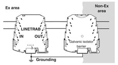 Protección contra sobretensiones en un módulo de carril DIN de una pieza de 6,2 mm de ancho para un circuito de señal flotante en tecnología de 2 conductores. Probado conforme a los siguientes tipos de protección en zonas Ex = Ex ia IIC / Ex iaD. Compatible con HART.