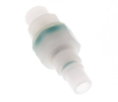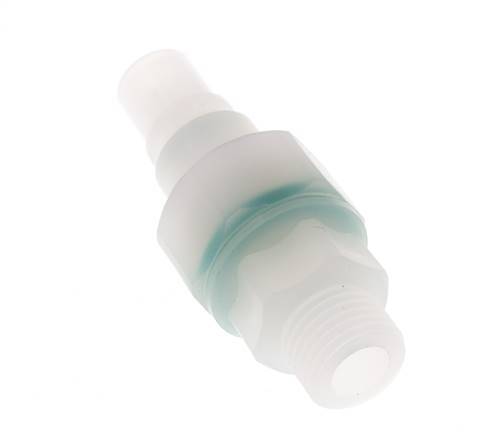 Conector de acoplamiento de fluoruro de polivinilideno (PVDF) DN 7.2 con rosca macho G 1/4 pulgadas. El acoplamiento tiene una válvula antirretorno para evitar el retroceso y la toma push-in también se cierra cuando se desconecta. El rango de presión de funcionamiento es de 0 a 8 bar (0 a 116 psi). El acoplamiento es adecuado para temperaturas entre -20 y 120 °C (-4 a 248 °F).