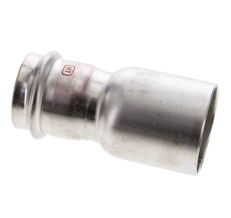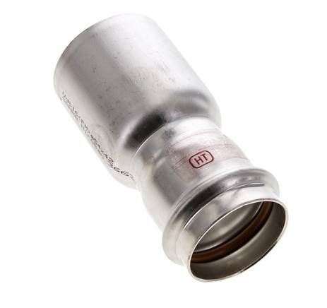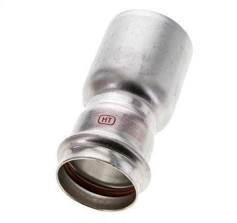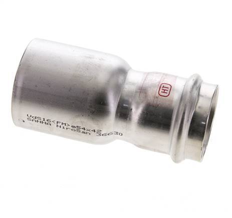 Se trata de un racor reductor fabricado en acero inoxidable 1.4404. El racor tiene un orificio de prensado macho (FTG) y un orificio de prensado hembra. La conexión 1 está diseñada para un tubo con un diámetro exterior de 42 mm y la conexión 2 tiene una conexión macho a presión con un diámetro exterior de 54 mm. El racor tiene una junta de estanqueidad de FKM. La presión máxima es de 16 bar (232 psi). El racor es adecuado para temperaturas de -20 a 200 °C (-4 a 392 °F). Temporalmente, la temperatura máxima puede ser de +280 °C (536 °F). La longitud del accesorio es de 112 mm.