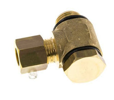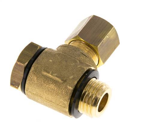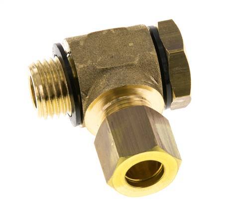 Esta junta giratoria acodada de latón está diseñada con una conexión roscada macho y un puerto de conexión de anillo de compresión. La conexión 1 es un anillo de compresión de 8 mm con una tuerca de unión M12x1. La conexión 2 tiene roscas macho G 1/4 pulgadas. El material de la junta es poliamida. La presión máxima es de 135 bar (1958 psi). El racor es adecuado para temperaturas de -20 a 80 °C (-4 a 176 °F). Se fabrica conforme a la norma DIN EN 1254-2.